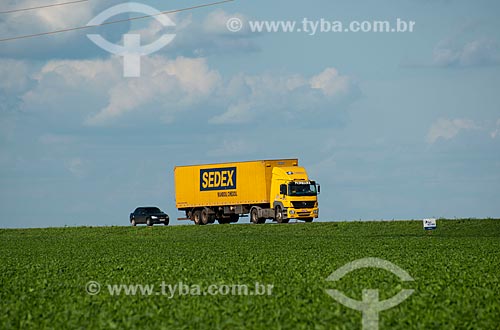 Subject: Bau truck of Correios passing in soybean planting - Stretch of highway BR - 153 / Place: Rondonopolis city - Mato Grosso state (MT) - Brazil / Date: 12/2011