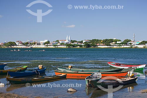 Subject: Fishing boats and of passenger transport anchored on the edge of the São Francisco River with the city of Juazeiro the background / Place: Petrolina city - Pernambuco state (PE) - Brazil / Date: 06/2012