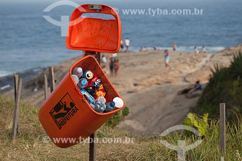 Subject: Trash can with water bottles and beer cans with the Pedra do Arpoador (Arpoador Stone) in the background / Place: Ipanema neighborhood - Rio de Janeiro city - Rio de Janeiro state (RJ) - Brazil / Date: 01/2013