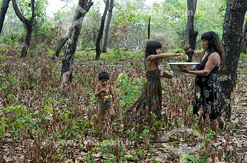 Subject: Woman and children of Aiha Kalapalo Village collecting Pequi (Caryocar brasiliense) - INCREASE OF 100% OF THE VALUE OF TABLE / Place: Querencia city - Mato Grosso state (MT) - Brazil / Date: 10/2012