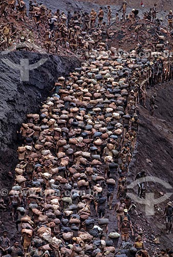 Subject: Workers carrying sandbags in the mining of Serra Pelada - considered the largest gold mine at open pit of world in the 80s / Place: Serra Pelada District - Curionopolis city - Para state (PA) - Brazil / Date: Década de 80