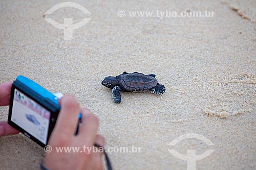 Subject: Tourist photographing pup of Hawksbill sea turtle (Eretmochelys imbricata), threatened species - Spawning controlled by TAMAR Project / Place: Tibau do Sul city - Rio Grande do Norte state (RN) - Brazil