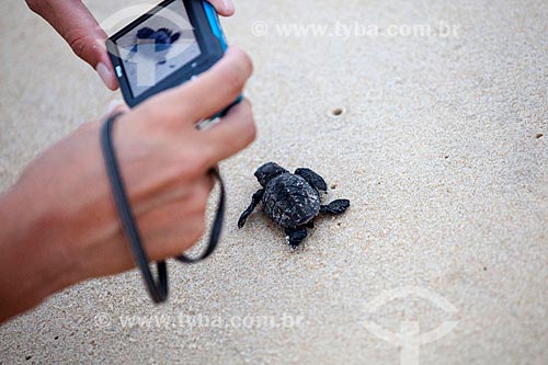 Subject: Tourist photographing pup of Hawksbill sea turtle (Eretmochelys imbricata), threatened species - Spawning controlled by TAMAR Project / Place: Tibau do Sul city - Rio Grande do Norte state (RN) - Brazil