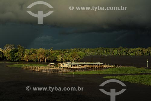 Subject: Warehouse for processing Jute on the banks of the Amazon River near to Itacoatiara with rain clouds in the sky / Place: Itacoatiara city - Amazonas state (AM) - Brazil / Date: 07/2013