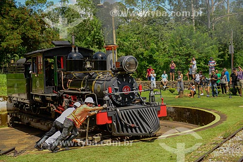 Subject: Men by maneuvering Steam train leaving the station the Estrada de Ferro Oeste de Minas inaugurated in 1881 used for sightseeing tour of Sao Joao del Rei to Tiradentes / Place: Tiradentes city - Minas Gerais state (MG) - Brazil
