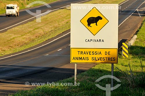 Subject: Plaque indicating crossing of Capybara (Hydrochoerus hydrochaeris) on Euclides da Cunha Highway (SP-320) / Place: Urania city - Sao Paulo state (SP) - Brazil / Date: 07/2013