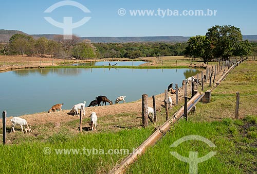 [+] agribusiness, [+] agricultural industries, [+] agro-cattle-raising, [+] animal, [+] Bahia, [+] billy-goat, [+] Capra aegagrus hircus, [+] corral, [+] farm, [+] fence, [+] goat, [+] grass, [+] herd, [+] irrigation canal, [+] lake, [+] landscape, [+] livestock, [+] mammal, [+] Northeast Region, [+] pasture, [+] rural landscape, [+] rural property, [+] rural zone, [+] agriculture, [+] channel
