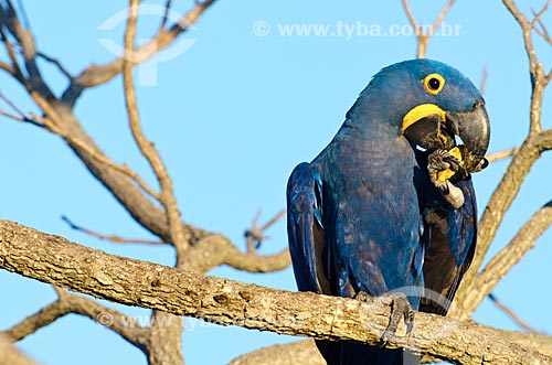 Subject: Hyacinth Macaw (Anodorhynchus hyacinthinus - also known as Hyacinthine Macaw - eating platonia insignis in Pantanal Park Road / Place: Corumba city - Mato Grosso do Sul state (MS) - Brazil / Date: 11/2011