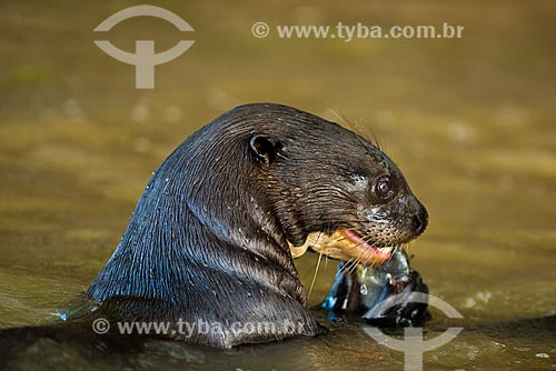 Subject: Giant otter (Pteronura brasiliensis) - Pantanal Park Road - eating a Piranha / Place: Corumba city - Mato Grosso do Sul state (MS) - Brazil / Date: 10/2012