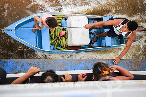Subject: Motorboat with products on sale near to boat that making the crossing between Belem (PA) and Manaus (AM) / Place: Breves city - Para state (PA) - Brazil / Date: 03/2014