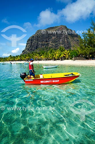 Subject: Lifeguards boat - beach with the mountain - Le Morne Brabant Peninsula - in the background / Place: Riviere Noire District - Mauritius - Africa / Date: 11/2012