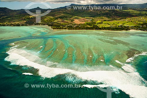Subject: Aerial photo of coral reefs with the village of Bel Ombre in the background / Place: Savanne district - Mauritius - Africa / Date: 11/2012