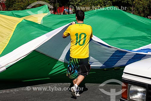 Subject: Man opening the brazilian flag near to Corinthians Arena / Place: Itaquera neighborhood - Sao Paulo city - Sao Paulo state (SP) - Brazil / Date: 06/2014
