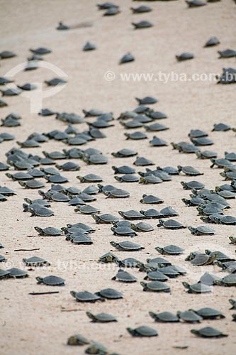 Subject: Puppy of Giant South American river turtle (Podocnemis expansa) on the banks of Guapore River - Ecovale NGO / Place: Sao Francisco do Guapore city - Rondonia state (RO) - Brazil