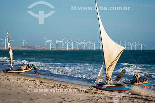 Subject: fisherman in raft - Canoa Quebrada Beach with the Canoa Quebrada Wind Farm in the background / Place: Aracati city - Ceara state (CE) - Brazil