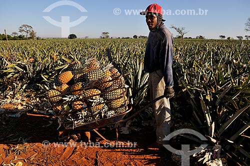 [+] agricultural product, [+] plantation, [+] tillage, [+] cultivation, [+] farm, [+] rural property, [+] rural zone, [+] agricultural production, [+] agribusiness, [+] Southeast Region, [+] triangle mineiro, [+] Minas Gerais, [+] pineapple, [+] ananas, [+] fruit, [+] harvest, [+] crop, [+] harvesting, [+] rural worker, [+] worker, [+] work, [+] working, [+] wheelbarrow