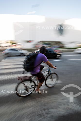 Subject: Cyclist passing over the crosswalk in the background Governador Leonel de Moura Brizola Municipal Library - Oscar Niemeyer Cultural Center / Place: City center - Duque de Caxias city - Rio de Janeiro state (RJ) - Brazil