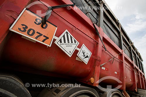 Subject: Detail of truck with transport plate of hazardous substances - BR-324 highway - near to Sao Sebastiao do Passe city / Place: Sao Sebastiao do Passe city - Bahia state (BA) - Brazil