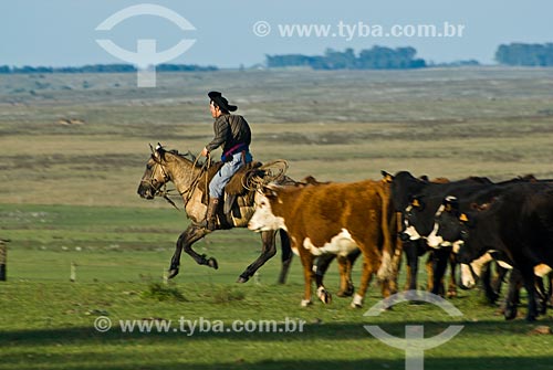 [+] rural worker, [+] cattle herding, [+] gaucho, [+] tradition, [+] rural property, [+] agribusiness, [+] farm, [+] South America, [+] agro-cattle-raising, [+] cattle, [+] cow, [+] bovine, [+] ruminant, [+] livestock, [+] pasture, [+] rural zone