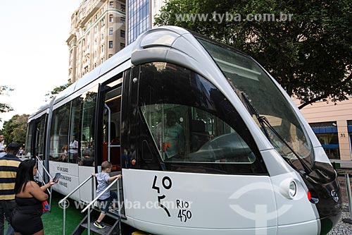 Subject: Child boarding - Light rail transit wagon on exhibition Cinelandia Square / Place: City center neighborhood - Rio de Janeiro city - Rio de Janeiro state (RJ) - Brazil