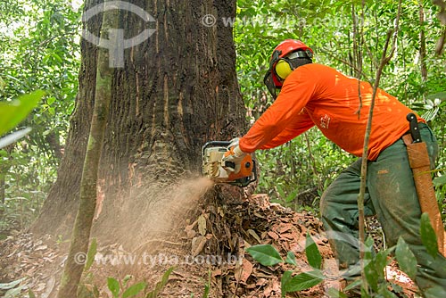 Subject: Worker of Tropical Forest Institute (IFT) cutting tree - Roberto Bauch Center of Forestry / Place: Paragominas city - Para state (PA) - Brazil