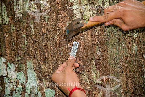 Subject: Worker puting identification on tree / Place: Paragominas city - Para state (PA) - Brazil