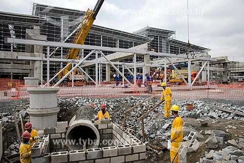 [+] labourer, [+] uniform, [+] machinery, [+] machine, [+] equipment, [+] terminal, [+] crane, [+] scaffold, [+] metal structure, [+] sewer, [+] sewage treatment, [+] sewer network, [+] sanitation, [+] tubing, [+] tube, [+] working, [+] worker, [+] person, [+] people, [+] adult, [+] man, [+] construction site, [+] work, [+] infrastructure, [+] construction, [+] reform, [+] duplication, [+] air transport, [+] air transportation, [+] transport, [+] transportation, [+] Guarulhos Airport, [+] Cumbica Airport, [+] airport, [+] public work, [+] great works, [+] civil construction, [+] Southeast Region