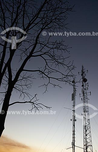 [+] Minas Gerais, [+] Southeast Region, [+] antenna, [+] transmit antenna, [+] telecommunication tower, [+] metal structure, [+] silhouette, [+] cellular antenna, [+] cell tower, [+] telecommunication, [+] transmission, [+] communication, [+] technology, [+] landscape, [+] vegetation, [+] tree, [+] trunk, [+] branch, [+] twilight, [+] sunset, [+] evening, [+] dusk, [+] nightfall, [+] nature