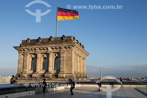 Subject: View of tower with flag - terrace of Palace of Reichstag (1894) - headquarters of German Parliament / Place: Berlin city - Berlin state - Germany