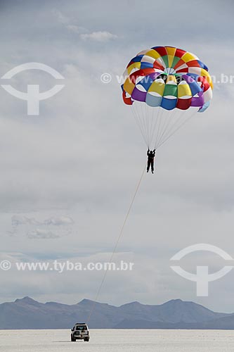 Subject: Paraglider during flight over of the Uyuni Salt Flat / Place: Uyuni city - Potosi department - Bolivia