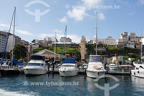 Subject: Berthed motorboats - Tourist Terminal Nautical of Bahia with the high city in the background / Place: Comercio neighborhood - Salvador city - Bahia state (BA) - Brazil