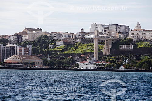 Subject: View of Mercado Modelo (1912) - to the left - with the Elevador Lacerda (Lacerda Elevator) - 1873 - to the right - from Todos os Santos Bay / Place: Comercio neighborhood - Salvador city - Bahia state (BA) - Brazil