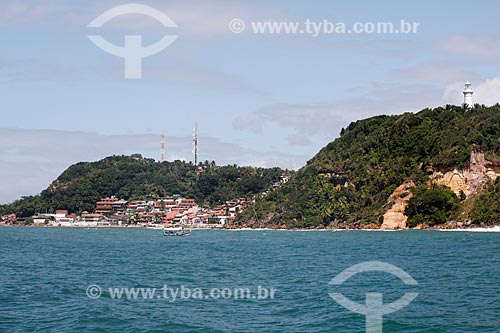 Subject: View of the 1st Beach - to the left - with the Sao Paulo Hill Lighthouse (1855) - to the right / Place: Sao Paulo Hill - Cairu city - Bahia state (BA) - Brazil