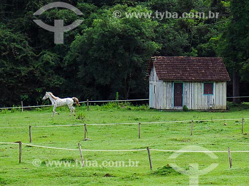 [+] farm, [+] rural property, [+] rural landscape, [+] country home, [+] simple house, [+] poor house, [+] modest house, [+] house, [+] home, [+] dwelling, [+] housing, [+] habitation, [+] residence, [+] civil construction, [+] South Region, [+] Rio Grande do Sul, [+] Gaucha Mountain Range, [+] fence, [+] horse, [+] Equus caballus, [+] mammal, [+] animal, [+] rural zone