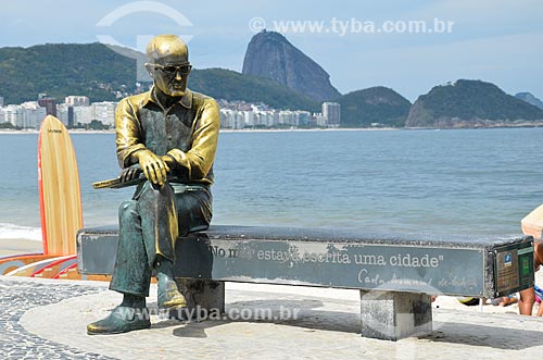 Subject: Statue of poet Carlos Drummond de Andrade on Post 6 with the Sugar Loaf in the background / Place: Copacabana neighborhood - Rio de Janeiro city - Rio de Janeiro state (RJ) - Brazil