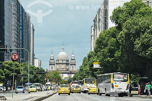 Subject: Traffic - Presidente Vargas Avenue with the Nossa Senhora da Candelaria Church (1609) in the background / Place: City center neighborhood - Rio de Janeiro city - Rio de Janeiro state (RJ) - Brazil