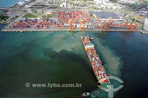 Subject: Aerial photo of the cargo ship berthed in TECON - Container Terminal - of the Port of Suape Complex / Place: Ipojuca city - Pernambuco state (PE) - Brazil