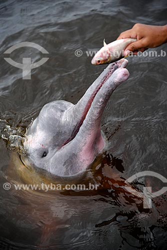 Subject: Instructor - dolphins platform feeding pink dolphin (Inia geoffrensis) - Anavilhanas National Park / Place: Novo Airao city - Amazonas state (AM) - Brazil