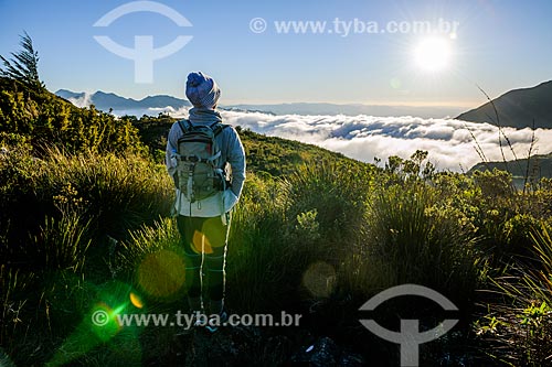Subject: Tourist observing the landscape during the trail of Couto Hill - Itatiaia National Park / Place: Itatiaia city - Rio de Janeiro state (RJ) - Brazil