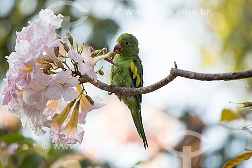 Subject: Yellow-chevroned Parakeet (Brotogeris chiriri) eating flowers of pink ipe tree (Tabebuia heptaphylla) / Place: Goias city - Goias state (GO) - Brazil