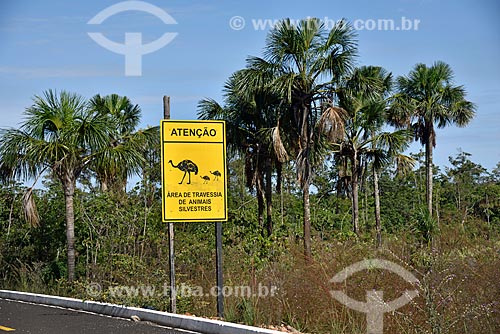 Subject: Plaque indicating the crossing of the wild animals - GO-239 Highway near to Chapada dos Veadeiros National Park / Place: Alto Paraiso de Goias city - Goias state (GO) - Brazil