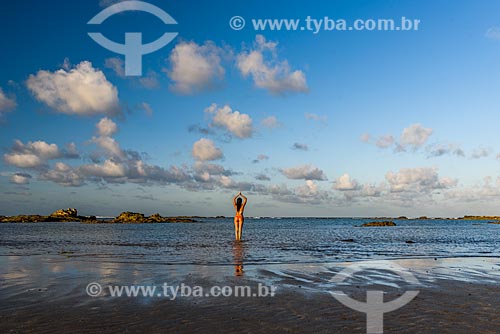 Subject: Woman practicing Yoga - 3nd Beach waterfront - Tadasana movement / Place: Sao Paulo Hill - Cairu city - Bahia state (BA) - Brazil