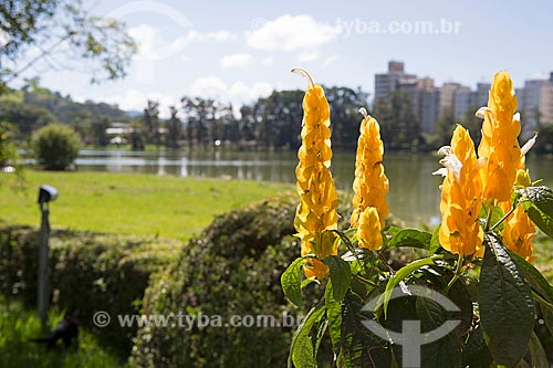 Subject: Detail of flower of the golden shrimp plant (Pachystachys lutea) on the banks of the Sao Lourenco Lake - Aguas de Sao Lourenco Park - with buildings in the background / Place: Sao Lourenco city - Minas Gerais state (MG) - Brazil
