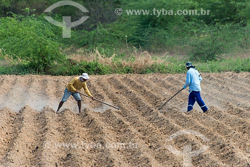Subject: Rural workers doing irrigation channel for planting - rural zone of the Truka tribe / Place: Assuncao Island - Cabrobo city - Pernambuco state (PE) - Brazil