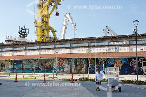 [+] port, [+] harbour, [+] adult, [+] touristic route, [+] leisure area, [+] recreation area, [+] leisure, [+] popcorn seller, [+] commerce, [+] economy, [+] street vendor, [+] street trader, [+] street trading, [+] informal economy, [+] informal trade, [+] popular commerce, [+] worker, [+] work, [+] working, [+] people, [+] person, [+] man, [+] square, [+] landscaping, [+] civil construction, [+] Porto Maravilha, [+] Orla Conde, [+] public park, [+] shed, [+] reach stacker, [+] crane, [+] machinery, [+] machine, [+] equipment, [+] touristic center, [+] warehouse, [+] capital, [+] city center, [+] Southeast Region, [+] portuary zone, [+] tourism, [+] Muhammad Ali Square, [+] Rio Port