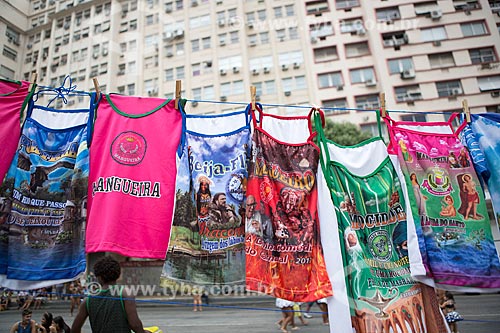 Subject: Samba school sleeveless shirts on sale during Cordao do Bola Preta carnival street troup parade / Place: City center neighborhood - Rio de Janeiro city - Rio de Janeiro state (RJ) - Brazil