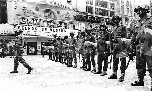 [+] civil construction, [+] art deco, [+] Floriano Square, [+] square, [+] culture, [+] Cinelandia, [+] cinema, [+] cultural facilities, [+] movie theater, [+] city center, [+] Cine Pathe, [+] special events, [+] repression, [+] military regime, [+] military dictatorship, [+] dictatorship, [+] architecture, [+] historical picture, [+] Police, [+] policing, [+] riot police, [+] Military Police, [+] crowd, [+] helmet, [+] shield, [+] army, [+] Armed Forces, [+] public service, [+] Southeast Region