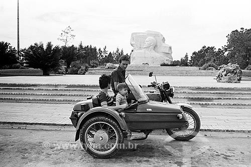 Subject: Family - motorcycle with sidecar in the Lenin Park with the marble bust of Lenin in the background / Place: Habana city - Ciudad de La Habana province - Cuba