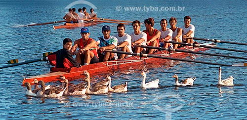 Subject: Canoeing training stopped - Rodrigo de Freitas Lagoon by geese bunch - 90s / Place: Lagoa neighborhood - Rio de Janeiro city - Rio de Janeiro state (RJ) - Brazil