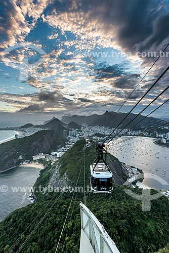 Subject: Cable car of Sugar Loaf making the crossing between the Urca Mountain and Sugar Loaf during sunset / Place: Urca neighborhood - Rio de Janeiro city - Rio de Janeiro state (RJ) - Brazil